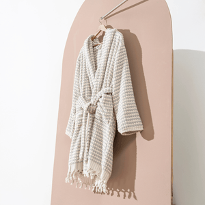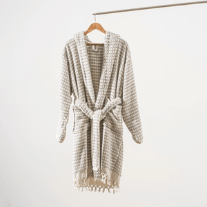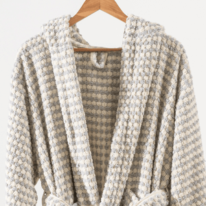 Discover the simplicity of our gray dressing gown – a perfect balance between functionality and timeless design. Made from 100% handwoven cotton with a unique, pom pom-inspired terry texture that is both fluffy and comfortable against the skin.