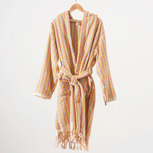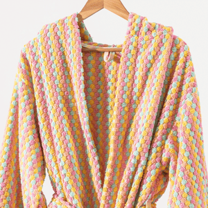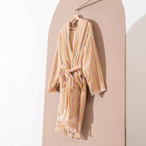 Höj din vardag med vår mångfärgade morgonrock - "Pom Pom". Denna unisex-badrock kombinerar bohemisk charm med högkvalitativt hantverk. Tillverkad av 100 % handvävd turkisk bomull med en unik frottéstruktur som känns både fluffig och mjuk mot huden.