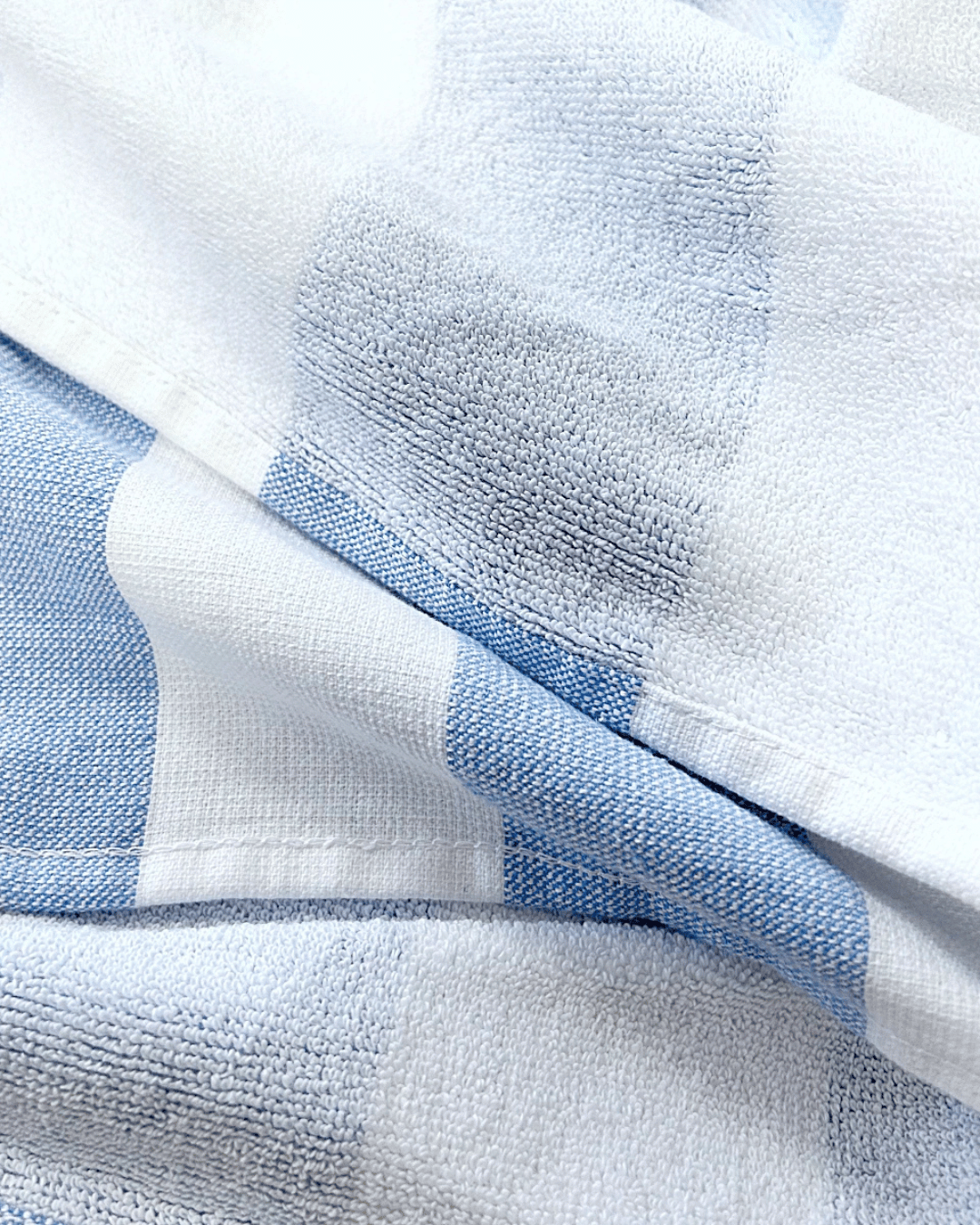 Upptäck Lagoon badhandduk i randig frottékvalitet med varannan rand i frotté, varannan i tunnvävd hamamkvalitet. Perfekt för dig som letar efter en frottéhandduk som väger mindre, torkar snabbare och tar mindre plats när den är hopfälld.
