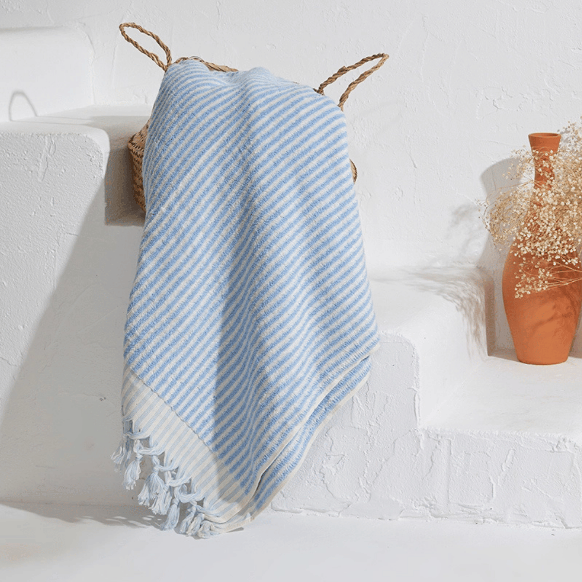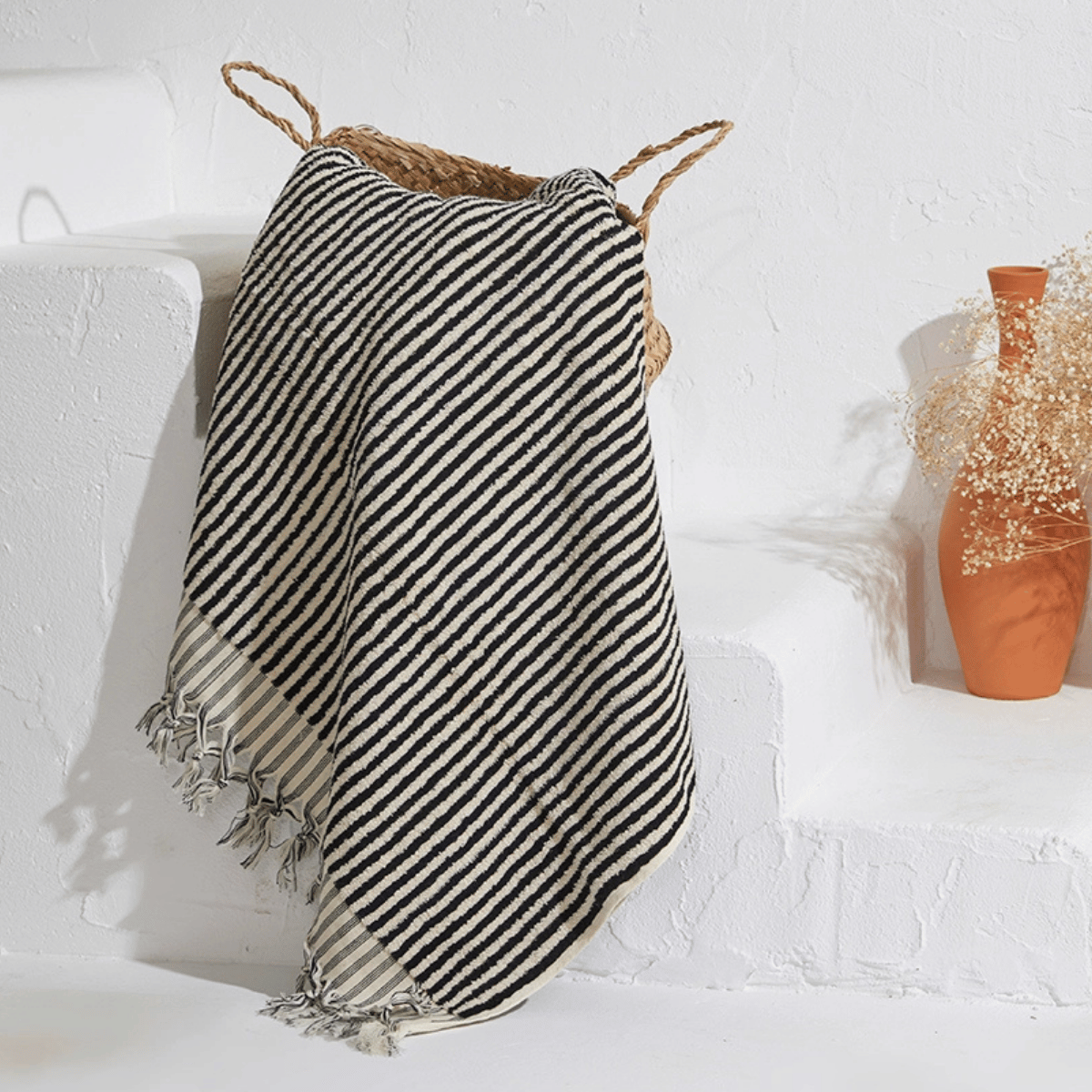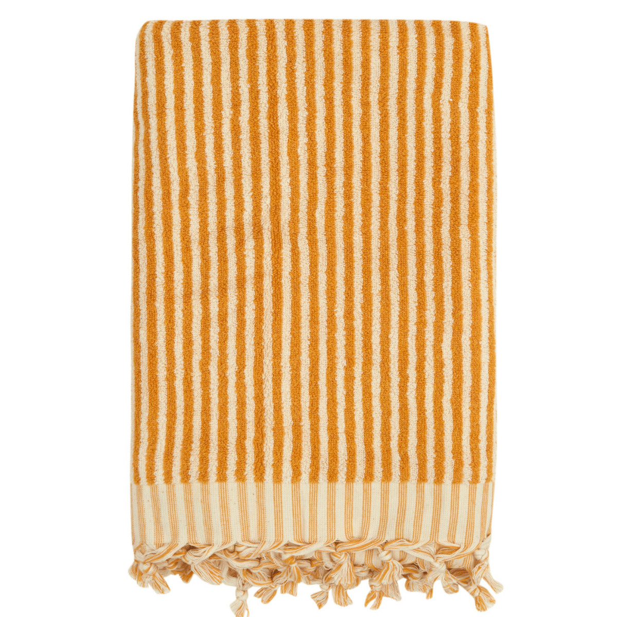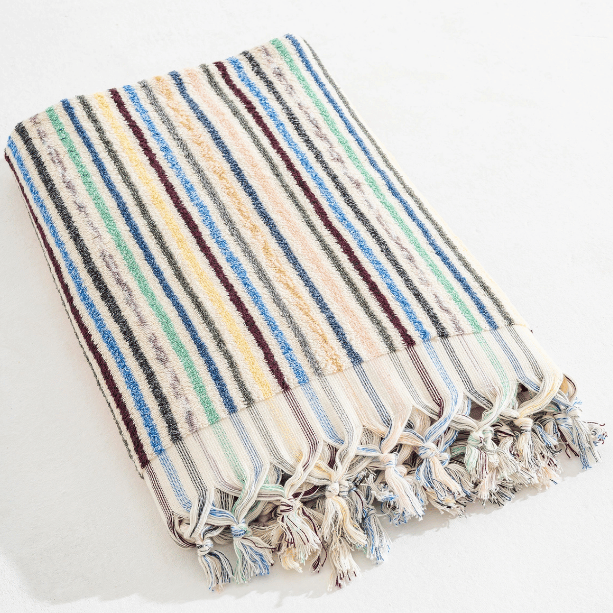 Frottékvaliteten gör handduken extra slitstark och superabsorberande, samtidigt som den förblir elegant och tidlös med sina klassiska randiga mönster. Varje handduk är noggrant handvävd för att kombinera traditionellt hantverk med modern stil.