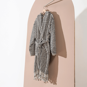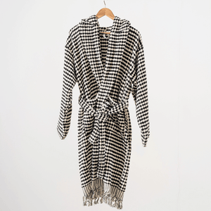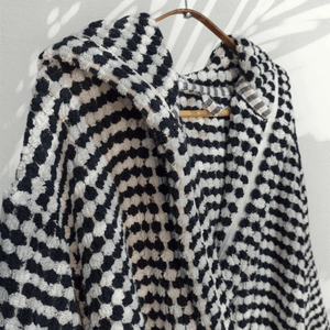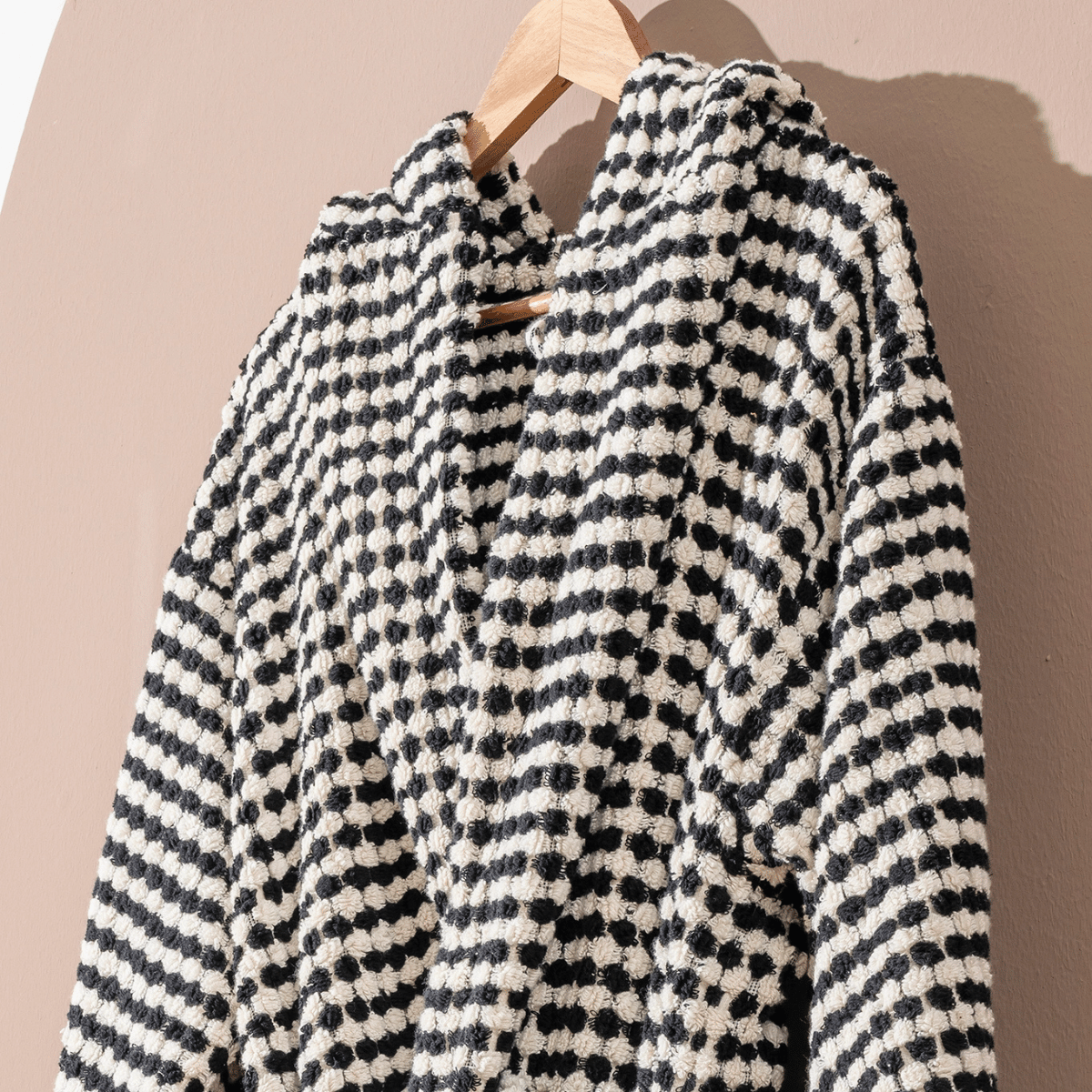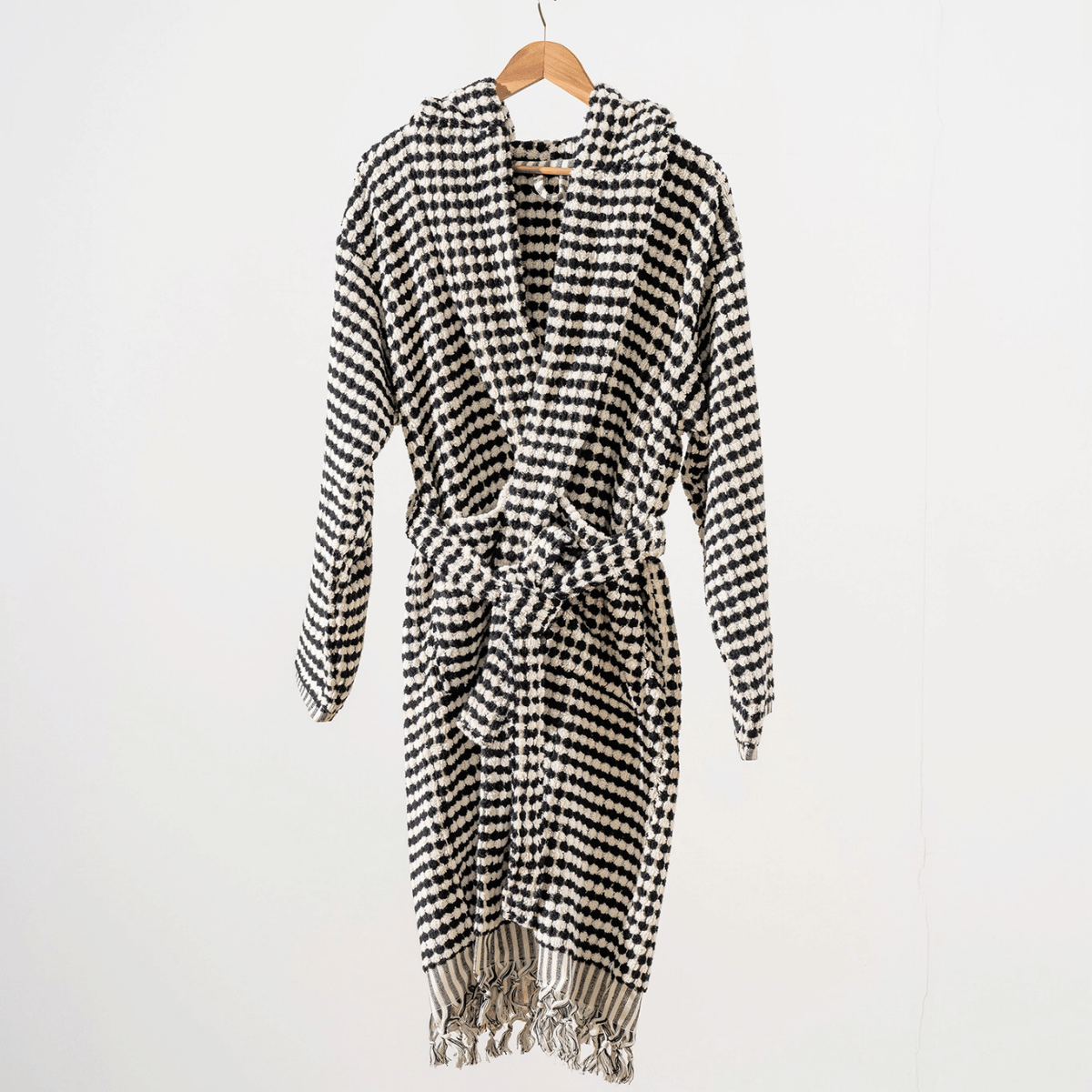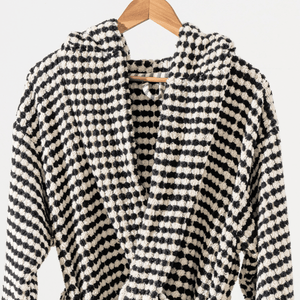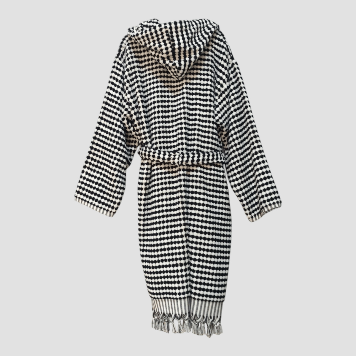 Skäm bort dig själv med vår lyxiga svartvita morgonrock - "Pom Pom". Den här badrocken är gjord för att ge både komfort och stil och är handvävd av förstklassig turkisk bomull med en distinkt textur. Den är lätt, mjuk, fluffig och förtvättad för extra mjukhet.